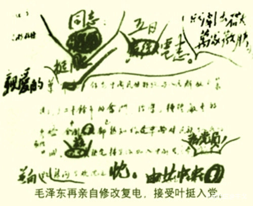 毛電這麼客氣,不是一件令人欣慰之事,説明直到這個時候,毛還沒有完全把葉看作自己人。對比1946年3月7日他親自審核接受葉入黨的回電,在“葉挺將軍”和“葉挺同志”的稱呼上斟酌再三,反覆修改,最終以“親愛的葉挺同志”落筆的情況看,作為舊學功底十分深厚的毛來説,在對什麼人用什麼稱呼的問題上是十分講究的。