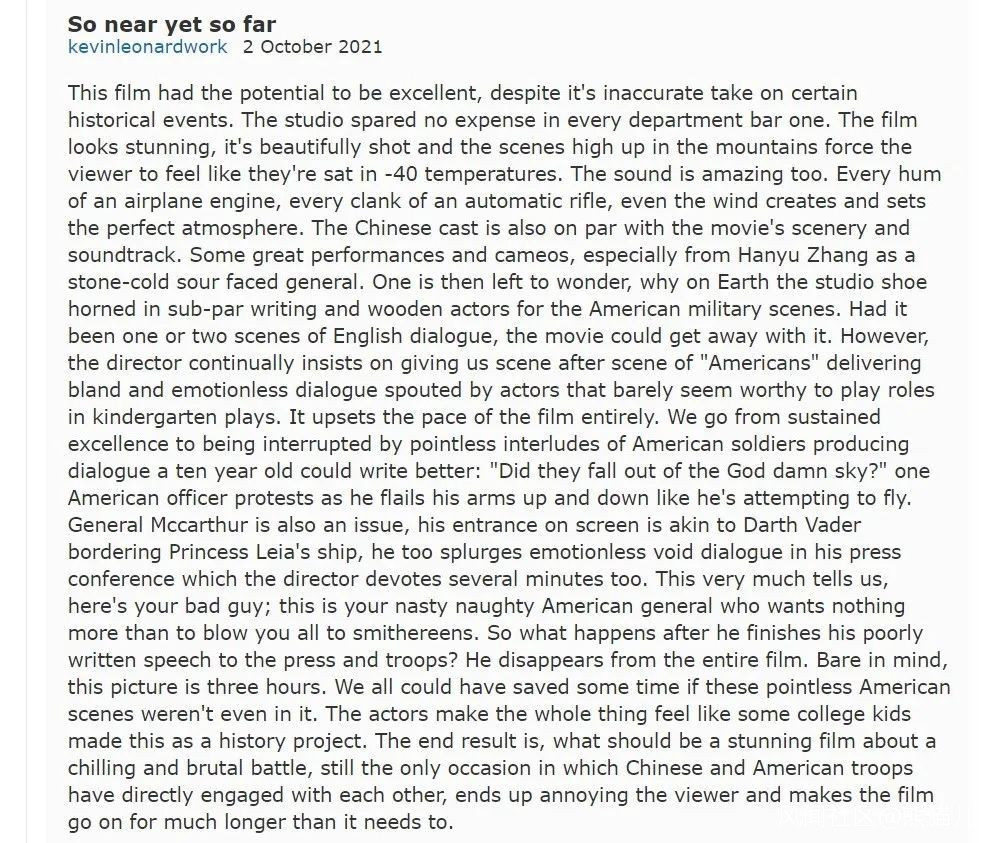 之前社區裏有個帖子,介紹長津湖上映後IMDb上的最早的兩條影評《ashes of time:美國人對中國電影《長津湖》的觀感,意外》,他們是這麼寫的: