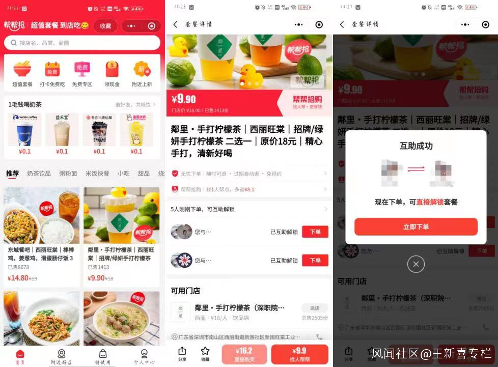 在這裏,用户在線上向好友分享低價套餐,然後線下到店使用套餐。就像拼多多拼團一樣,拼得越多,優惠越多,1毛錢喝奶茶,9.9元就能吃飽飯、吃好飯。
