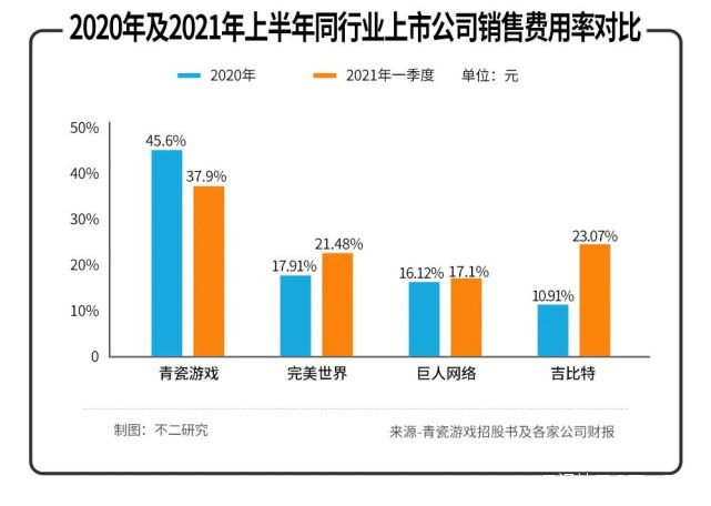 在2021年一季度,青瓷遊戲銷售費用率為37.9%,依然高於完美世界21.48%、巨人網絡17.1%、吉比特23.07%。