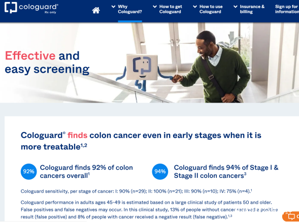 Cologuard的官網發佈了產品檢測腸癌的靈敏度:整體可以檢測出92%的腸癌,其中對1期和2期腸癌的檢測靈敏度達到94%。同時,官網也披露了假陰性(漏檢率)數據為8%。