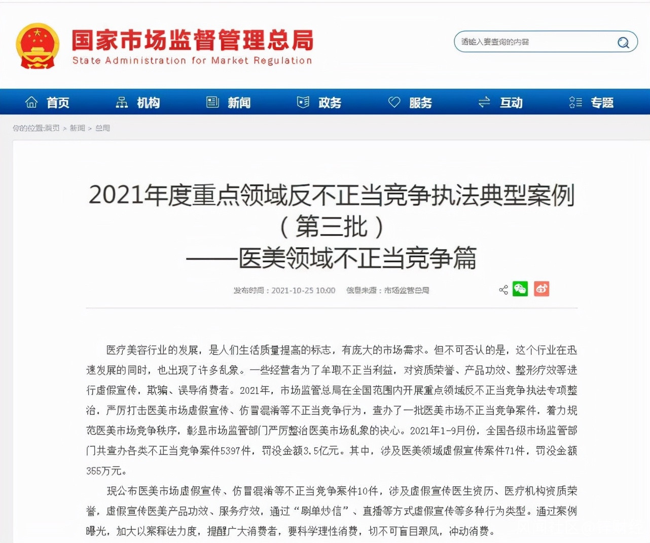 10月25日,市場監管總局公佈《2021年度重點領域反不正當競爭執法典型案例(第三批)——醫美領域不正當競爭篇》,曝光了10件醫美市場虛假宣傳等不正當競爭案件,重點涉及虛假宣傳醫療機構資質榮譽,虛假宣傳醫美產品功效、服務療效等多種“虛假營銷”行為。