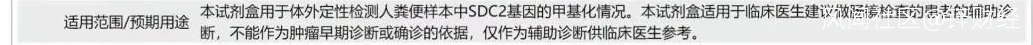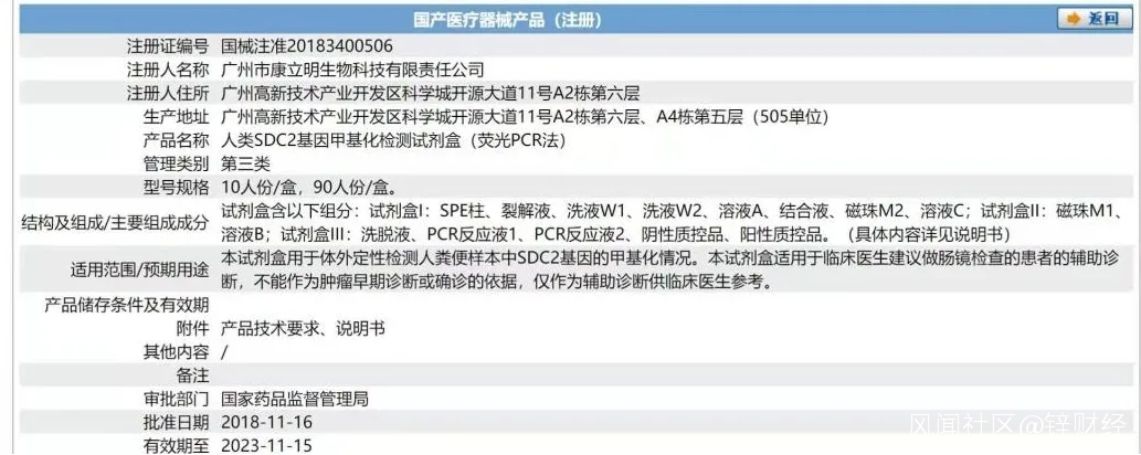 事實上,Cologuard使用的是多靶點糞便DNA檢測,包括便潛血、7個基因突變位點和2個基因甲基化位點,經糞便DNA提取、穩定、位點檢測、便潛血檢測後,通過數學邏輯迴歸算法得到結果。而康立明旗下的長安心據藥監局官網產品註冊信息為“用於體外定性檢測人糞便樣本中SDC2基因的甲基化情況”,只有單一基因甲基化檢測。