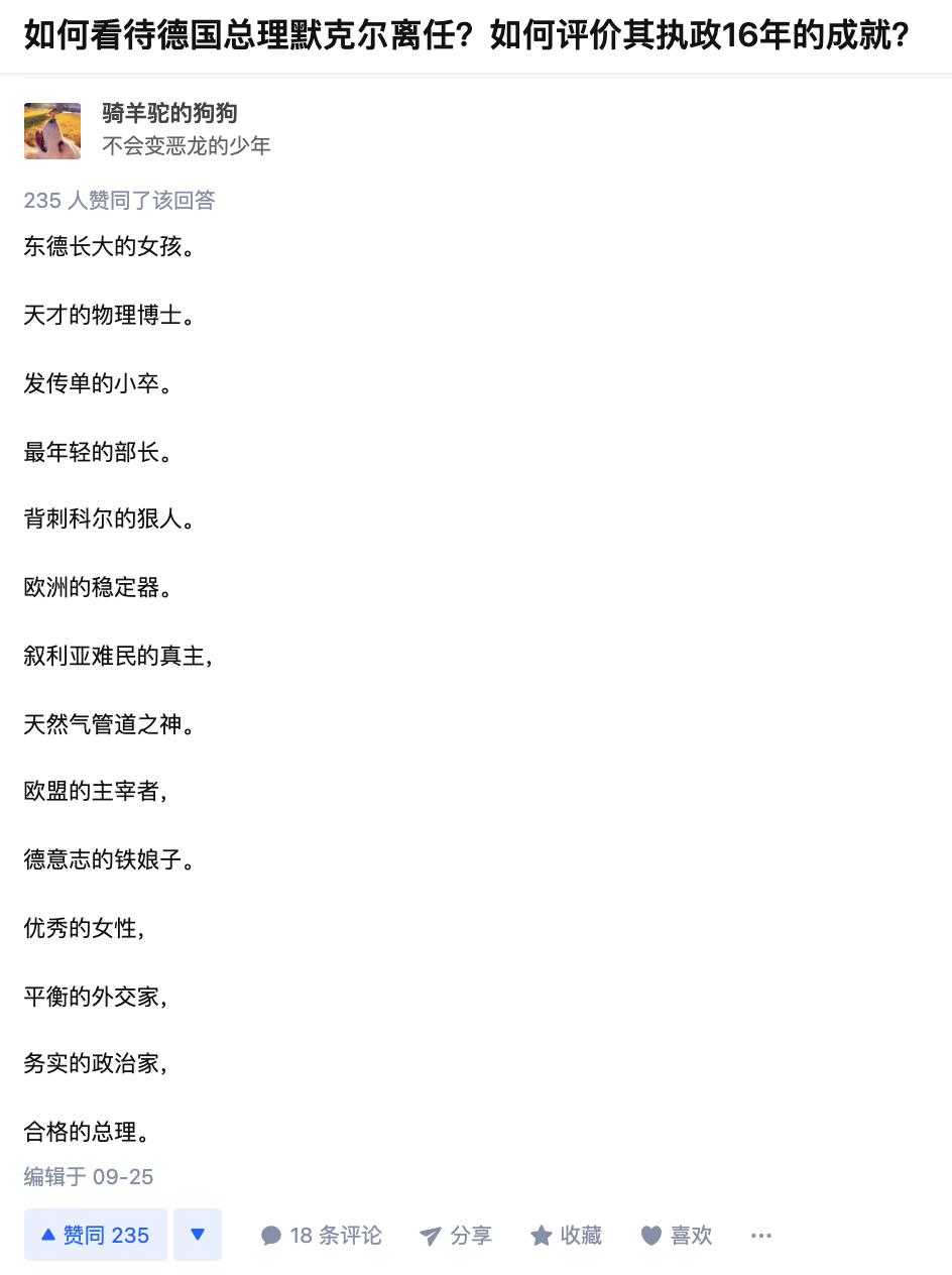 稱默克爾執政時期是“德國現代史上最偉大的時期之一 ”,還稱多虧了默克爾,歐洲才沒有“分裂 ”。