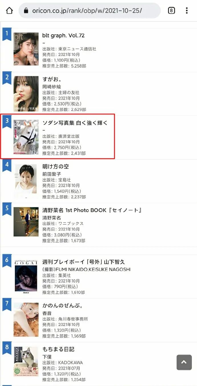 原來,據日本公信榜統計,上一週的寫真集銷量排行榜中,一匹名叫“蘇妲己”的賽馬力壓眾多明星,拿下了第三名的位置。