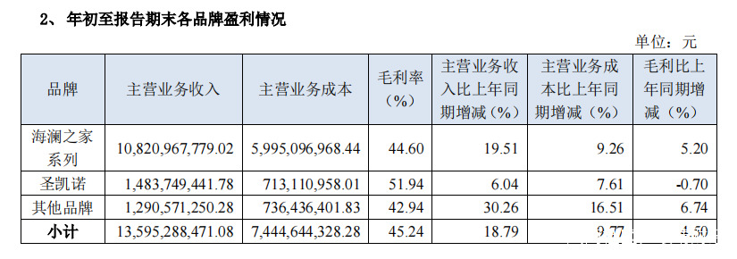 在男裝主賽道取得輝煌成就同時,海瀾之家開拓集團化發展戰略,也逐漸成為公司新的增長曲線。三季報顯示,海瀾之家主品牌營業收入達到108.2億元,同比增長19.51%,聖凱諾品牌主營業務收入為14.84億元,同比2020年Q3增長6.04%。表現亮眼的則是其它品牌集羣,主營業務收入為12.9億元,同比增長30.26%。