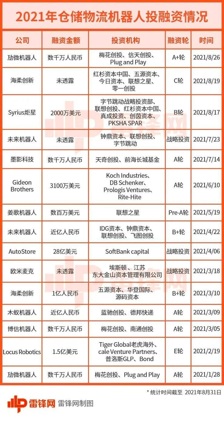 · 2021年9月22日,物流倉儲機器人科技企業“海柔創新”完成D輪融資,融資額達2億美元;