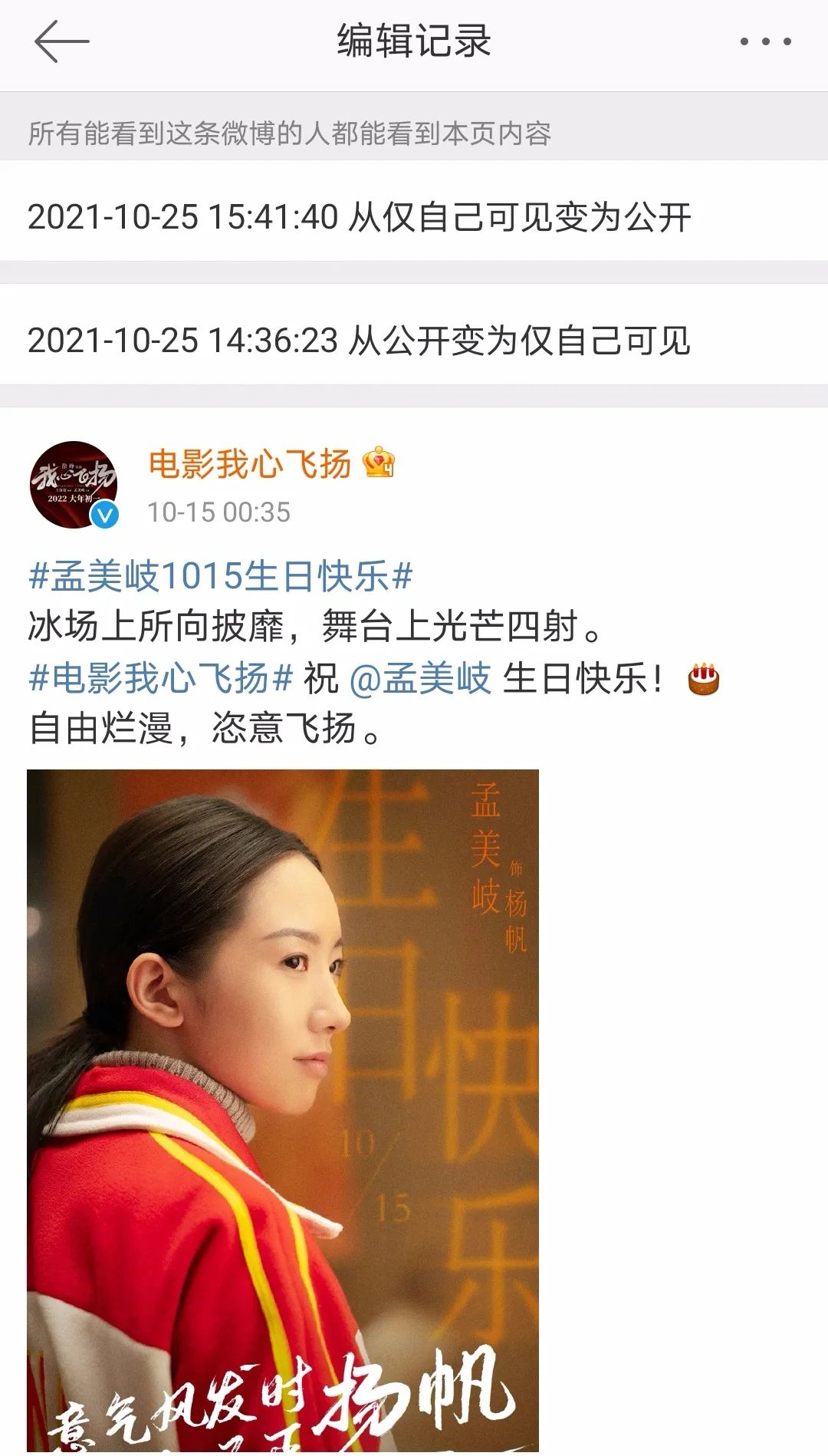 除了品牌方面,目前孟美岐參加的綜藝《舞蹈生》還在正常錄製當中。未播作品中,助力冬奧會的電影《我心飛揚》也暫時沒有新的動態出現,只是在事發當天,短暫的將10月15日為孟美岐慶生的微博設置了權限,之後又重新恢復。