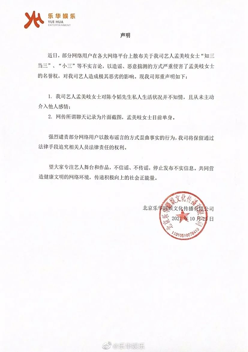 10月25日早晨8點,陳令韜發佈微博,除向家人和工作夥伴致歉外,還透露出自殺傾向。隨後上午11點,樂華娛樂發佈聲明稱,旗下藝人孟美岐對陳令韜的私人生活並不知情,否認其“知三當三”的行為,並表示孟美岐現在單身。