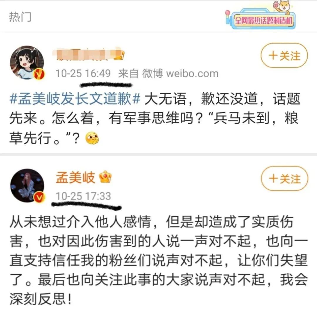 採訪發出一個多小時後,孟美岐又發佈了一條微博,對因此事受到傷害的當事人以及粉絲、網友道歉,這也是與此事相關的最後一個動態。不過有趣的是,在孟美岐正式發博道歉前,#孟美岐髮長文道歉# 的詞條就已存在多時。