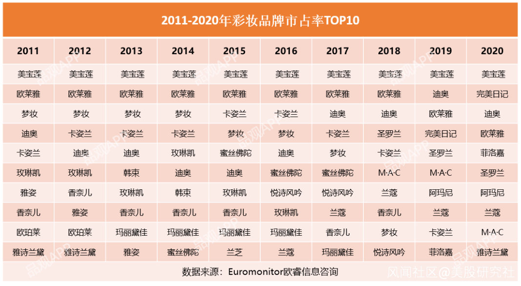 此前,中國化妝品市場佔有率前列,曾長期被海外品牌佔據。根據歐睿諮詢數據,2010-2018年,美寶蓮和巴黎歐萊雅一直雅穩穩佔據中國彩妝品牌市場份額第一、二名。到2020年,名單上的第二變為2016年成立的完美日記,在國內美妝市場的市佔率達到6.7%,僅次於美寶蓮。