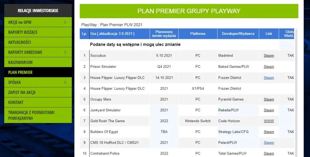 與PlayWay一樣,Gaming Factory也有一份“即將發佈遊戲”的時間表。那份列表共包含31款遊戲,目前只有6款問世,其餘的都還沒有具體發佈日期……科斯托夫斯基説,為了吸引投資者,這類時間表非常重要。“我們不能制定一份沒有意義的遊戲製作計劃,因為那可能誤導投資者。”他説。