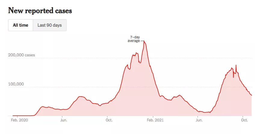 9月中旬開始,美國新冠病例開始逐漸下降,雖然目前每天平均感染的人數還是高達7萬人,但已經比一週前下降了20%。住院人數、死亡人數也都在下降。