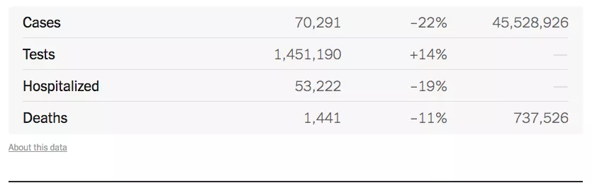 而完成疫苗接種的美國人佔總人口57.9%, 大約1.91億人。12歲以上符合接種疫苗資格的人中,仍然有22.3%的美國人尚未接種疫苗。