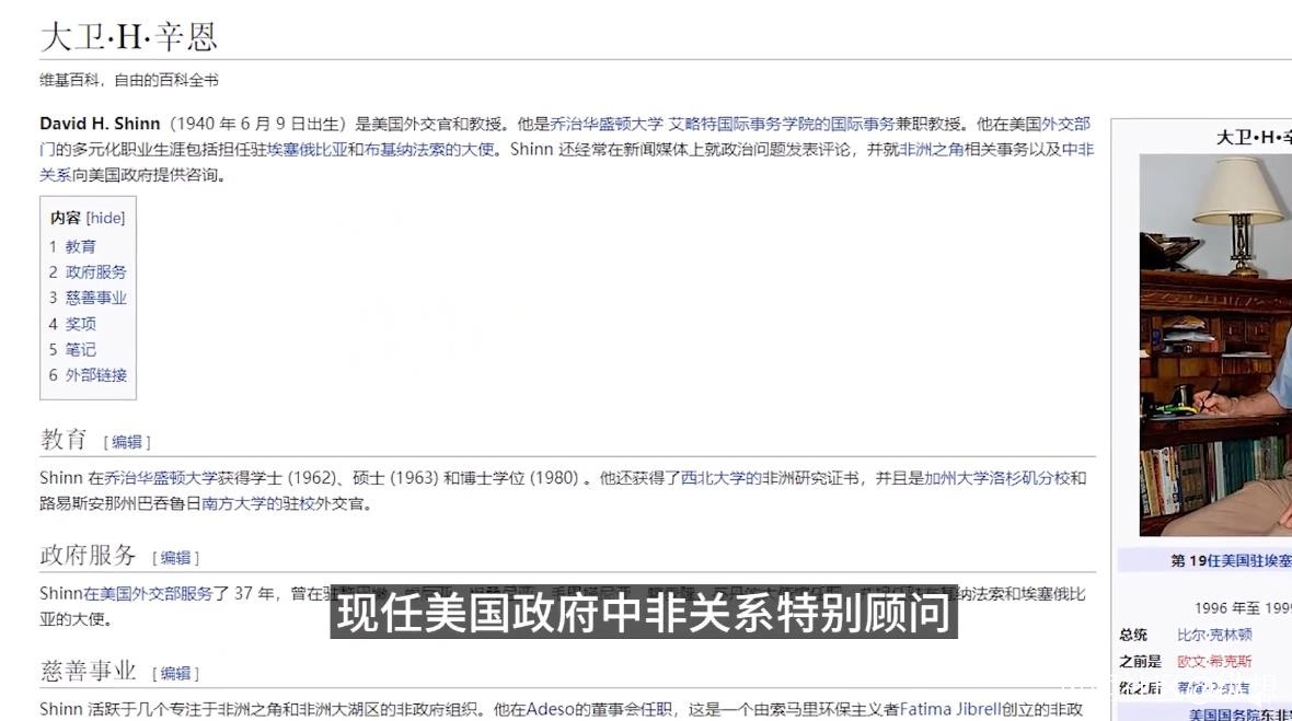 這還沒完,“中南屋”的美方成員中還有大牛級人物:大衞·H·辛恩,現任美國政府中非關係特別顧問,在美國國務院從事外交工作37年,曾擔任美駐埃塞俄比亞、布基納法索的大使,東非事務主任,索馬里問題工作小組副主任,多次經歷非洲國家的叛亂、參與當地重建。