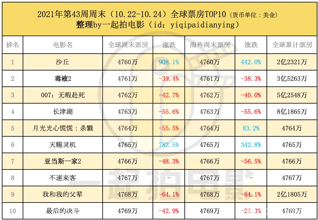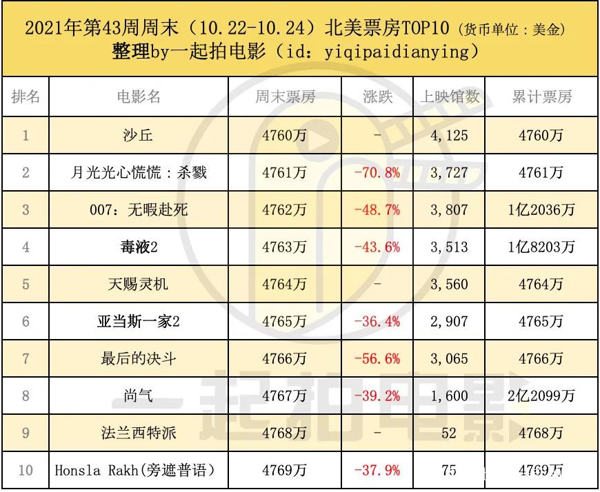 依靠中國大陸與北美等44個新開市場的助攻,科幻大作《沙丘》上週末首度摘得周冠,累計票房超過2.2億美元。在同步HBO max流媒體同步情況下,北美收入了4101萬美元是後疫情時代院網同步第三好的成績,其中IMAX票房達907萬美元佔市場份額的22%,超過50%的屏幕來自特種屏,顯示其專為大銀幕打造的特效場景對觀眾具有相當大的吸引力。