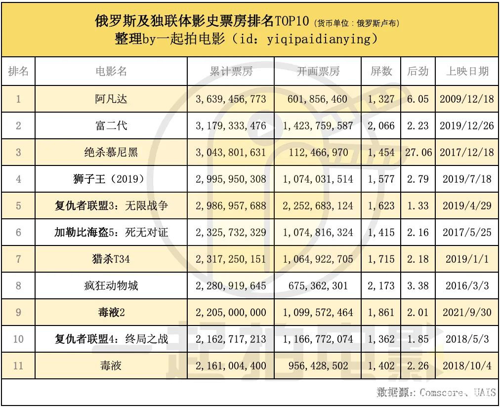 《毒液2》則拿下亞軍,整體走勢持平R級超英平均水準。海外方面在53個市場穩居31第一,同期領先疫情後所有好萊塢影片,目前不包括大陸全球票房將瞄準5億美元。其中拉美市場在進入第三週後依然在10個市場中的9個保持冠軍,累計票房達4590萬美元。而截至上週末它在俄羅斯及獨聯體的累計票房達22億盧比不僅超越了前作更順利打進影史票房前十,最終來到第6名不成問題。