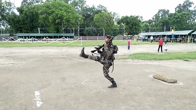 第二段畫面則有些出糗,印軍士兵同樣身着叢林偽裝服,在地道口爬出後,彎腰拿槍之際,腳底明顯一滑,險些摔倒在地。隨後,這名士兵又快速衝到目標木樁面前,進行了一場“氣勢洶洶”的刺殺演示。