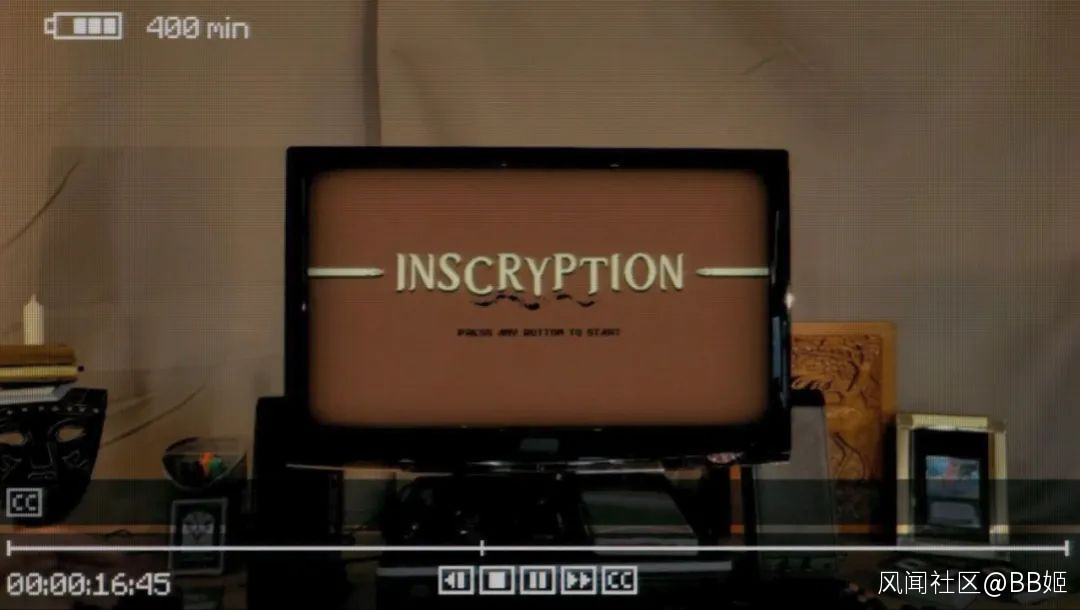 原來是一款遊戲。大屁股顯示屏裏逐漸浮現出Inscryption幾個大字,播放時甚至還能聽到卡神的畫外音……正如我們第一次打開遊戲一樣。