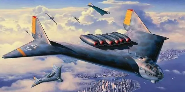 如果説飛碟實在是有畫餅的嫌疑,那麼「銀鳥」飛行器就有些實現的可能了。所謂的銀鳥,按現代的分類,就是亞軌道飛行器或空天飛機。這是一架起飛重量100噸左右的火箭飛機,通過助推火箭將其發射入太空;然後在大氣層邊緣高速飛行,並最終將彈藥投送到目標上空。到今天也沒有哪個國家能造出這種銀鳥,德國在其上消耗的資源也就全打了水漂。