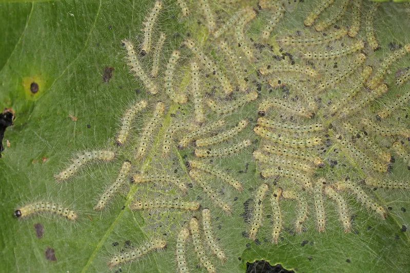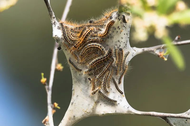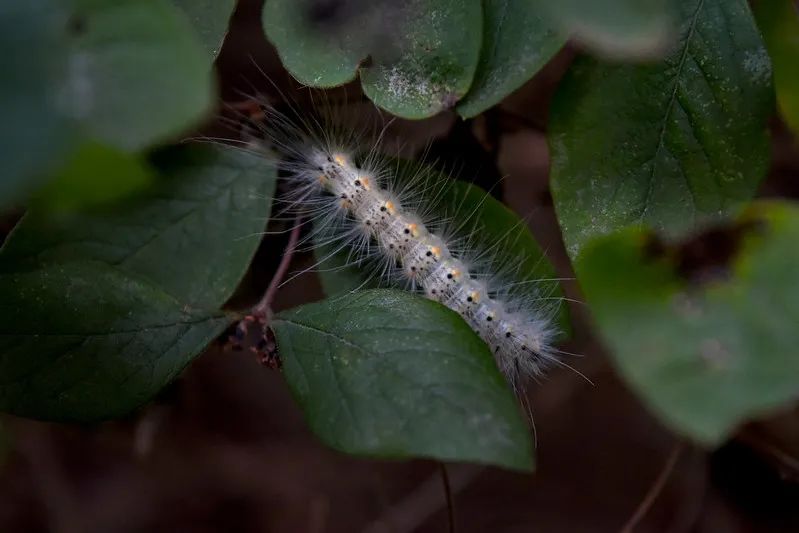 它可是一個名副其實的“大胃王“。在蟲卵孵化出來後,這些幼蟲就開始吐絲織網、咀嚼葉子。經過四齡期之後,這些幼蟲的食量就開始暴增,每天都在不停地啃食葉片,甚至開始吃樹皮。幾天的時間就能把整棵樹的樹葉全都吃光。