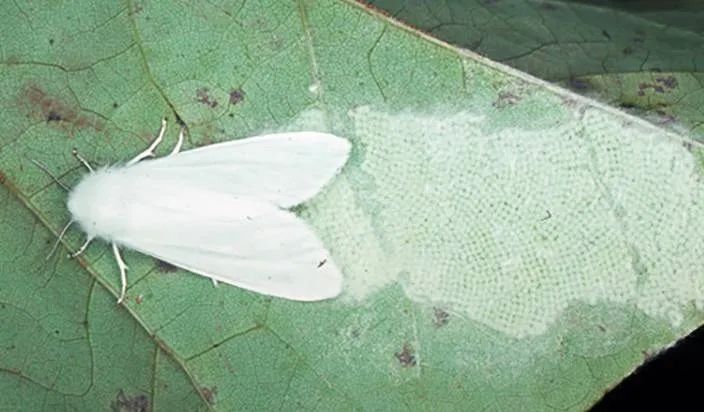 在葉子下大量產卵的成年美國白蛾。| Bugwood.org.