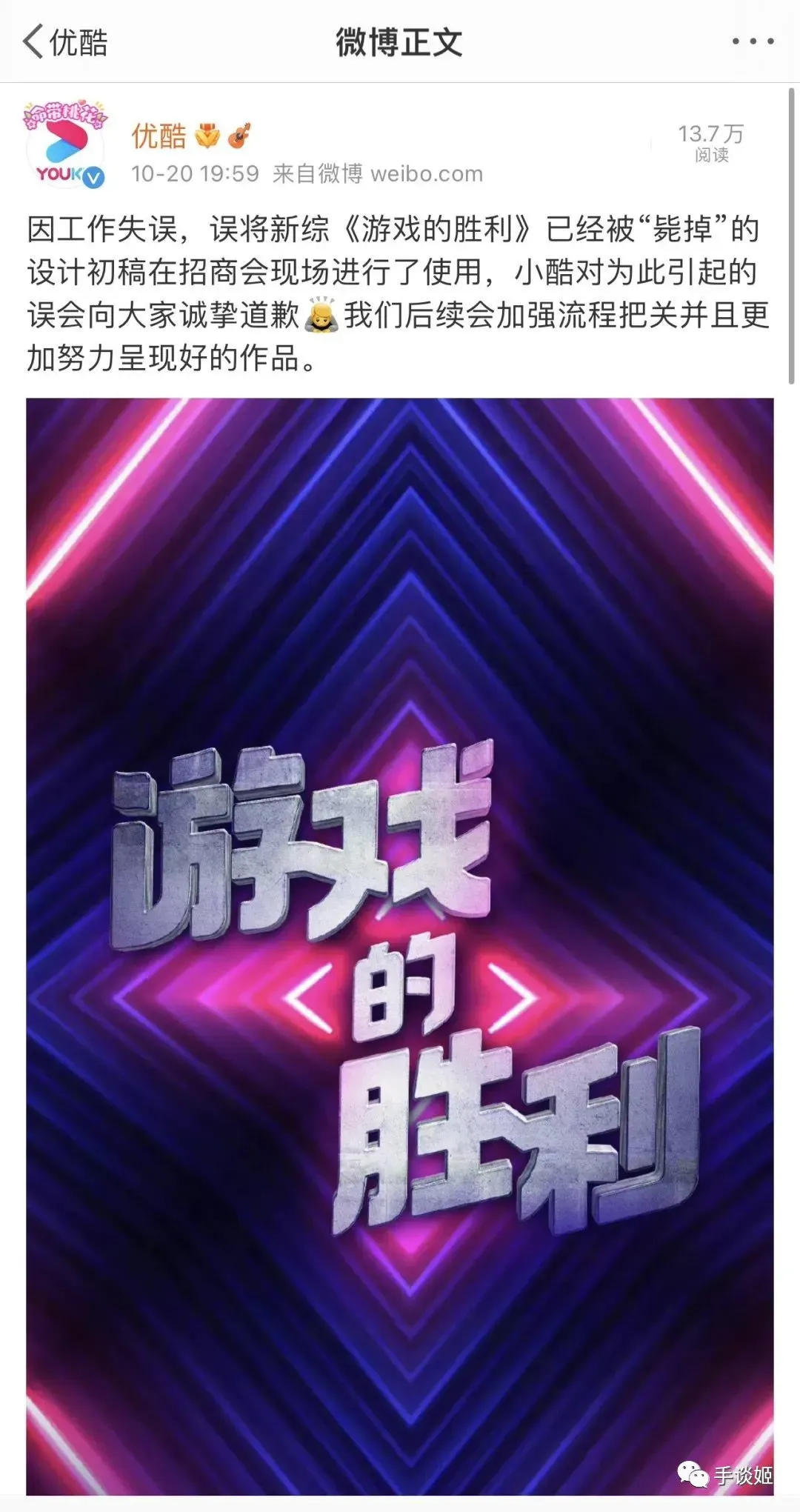 上週,優酷搞了個《魷魚的勝利》的網綜,然後被網友們爆錘了,於是優酷趕緊改口説,搞錯了搞錯了,都是誤會!這名字已經被斃掉了,然後換上了新名字《遊戲的勝利》。