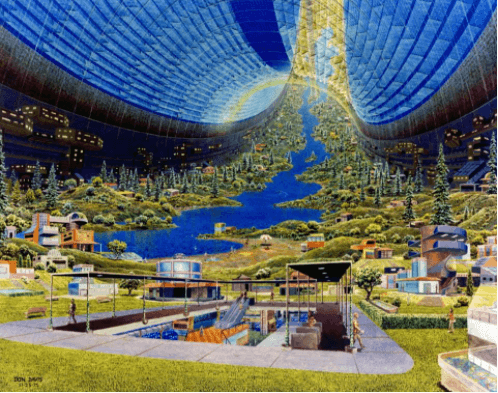 奧尼爾提出了三種太陽能驅動的設計方案,它們通過旋轉來模擬重力,並且可以停留在拉格朗日點(譯註:一個小物體在兩個大物體的引力作用下在空間中的一點,在該點處,小物體相對於兩大物體基本保持靜止)。