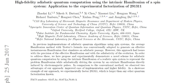 杜江峯和彭新華等人2017年用量子算法分解291311的論文