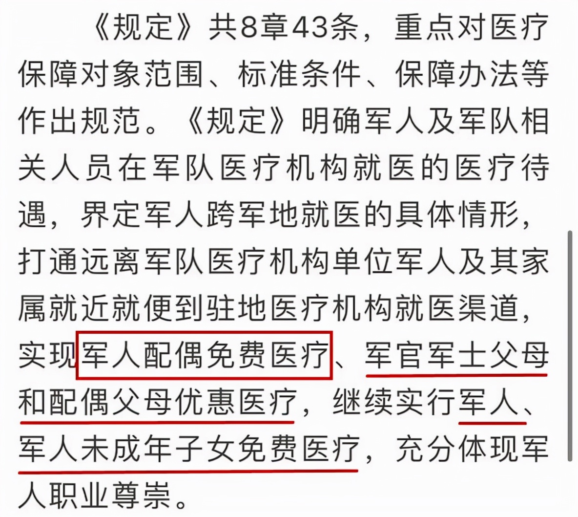 該規定明確了,實現軍人配偶免費醫療、軍官軍士父母和配偶父母優惠醫療,繼續實行軍人、軍人未成年子女免費醫療,充分體現軍人職業尊崇。