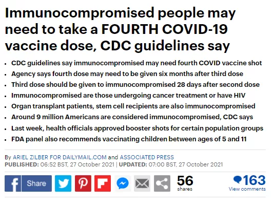 CDC表示,該機構不計劃將額外接種的疫苗稱作“加強針”,因為據信免疫低下者在前兩次接種疫苗後並未產生完全免疫反應。據約翰霍普金斯大學的一項研究發現,與大多數接種疫苗的人相比,免疫功能低下的接種者感染新冠住院或死亡的可能性高出485倍,而且他們也更有可能將病毒傳播給有密切接觸的人。