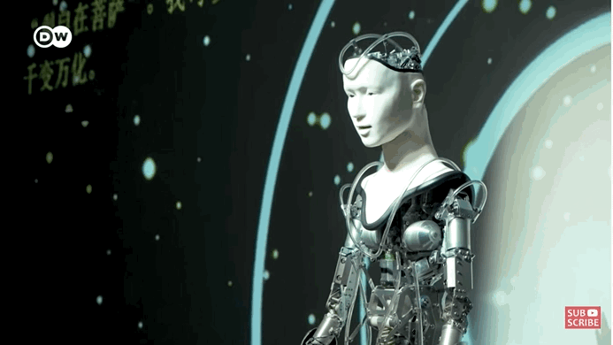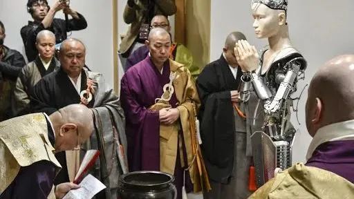 在他們寺院,你能時不時看到一眾和尚,圍着機器人觀音低頭參拜的場面,簡直魔幻!