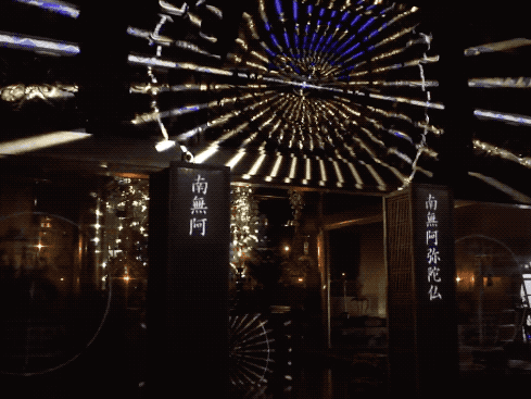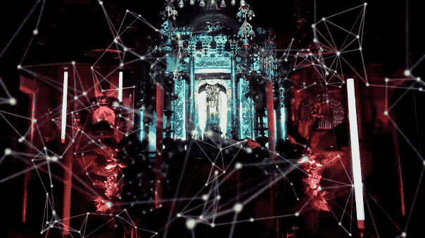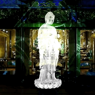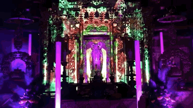 平時莊嚴肅穆的佛堂被裝上各色霓虹燈,隨着節奏的起伏,佛像上映出五彩斑斕的光,頗有番未來主義美學。