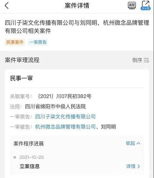 10月25日,戰事升級,四川子柒文化傳播有限公司(簡稱四川子柒)正式起訴杭州微念及其法人劉同明。
