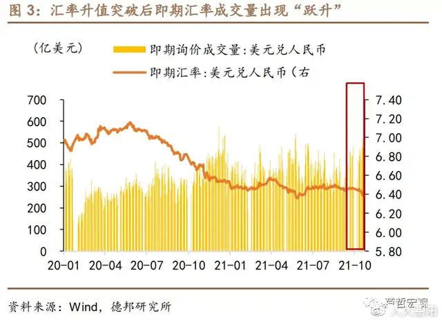 **從短期誘發因素看,多重偶發因素共振引發人民幣匯率強勢升值。**2021年7月至10月上旬離岸美元兑人民幣匯率形成了以6.43為下限、6.51為上限的震盪區間,由於一個多季度的時間裏,人民幣匯率穩定在此區間內震盪,在此兩個點位形成了密集成交區。在10月19日離岸人民幣匯率真正破位升值之前,9月至10月總計有多達9次外匯市場日內交易嘗試突破6.43,可惜均未能成功,而10月19日當日離岸人民幣匯率升破6.43直接達到6.40以內。