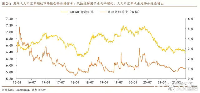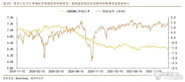 聚焦於“波動率”以及波動率的信號,結合不同行權價格和不同到期期限之間的期權合約隱含波動率之間的關係,可提取到對未來匯率價格變動的信息:(1)風險溢價(Risk Premium):當風險溢價從週期高點回落時,往往預示着匯率即將進入震盪期;當風險溢價擺脱週期低位開始回升時,一般指向匯率將從震盪區間突破;(2)期限溢價(Term Premium):期限溢價越高,表明未來發生極端事件的概率也越高;(3)微笑曲線(Smile/Skew):分為1年期CNH風險逆轉(Risk Reversal)和蝶式期權(Butterfly):當市場形成單邊升值趨勢/單邊升值預期、或單邊貶值趨勢/單邊貶值預期時,更高行權價往往被投資者賦予更高溢價,推升風險逆轉因子。