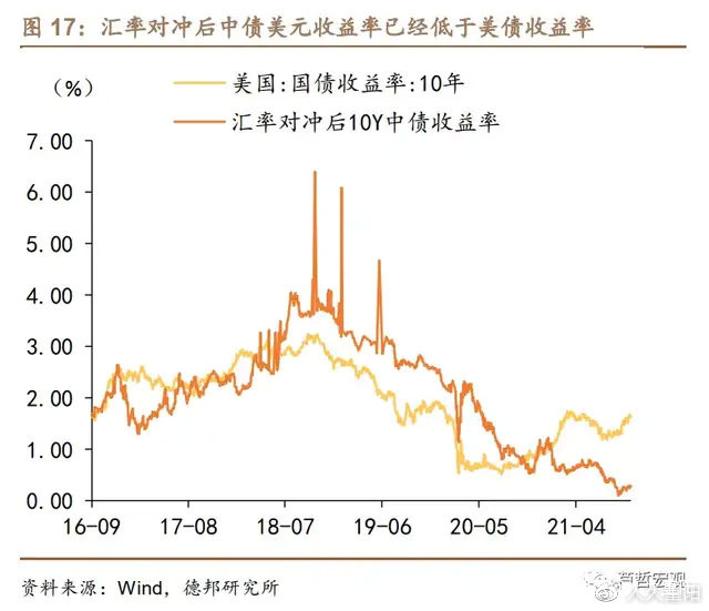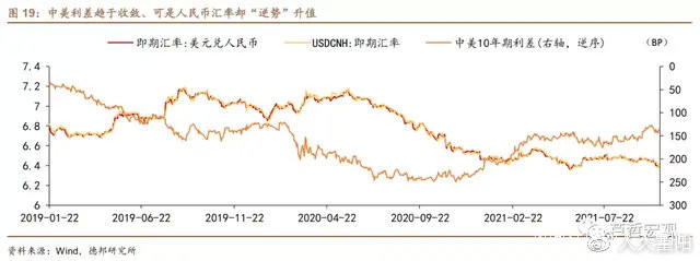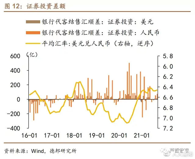但是由於中國尚未實現資本與金融賬户的可自由兑換,中國居民部門對海外的證券投資還受到限制,海外部門對中資資產的投資也有額度控制,證券投資差額的變動對人民幣匯率的影響並不取決於人民幣匯率預期升貶值,而是境內外“利差”的環境。