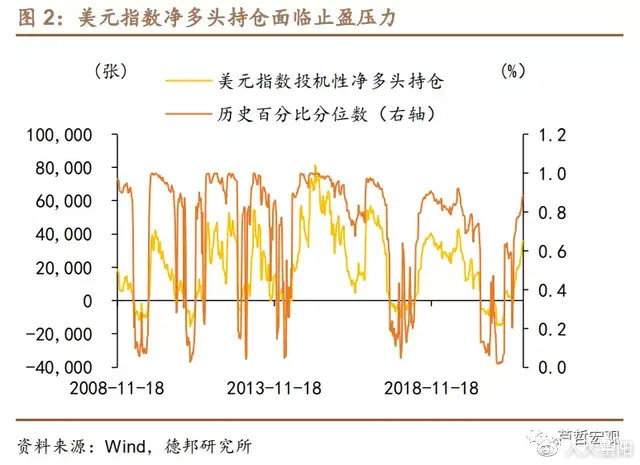 (2)美元指數期貨淨多頭頭寸面臨止盈壓力,根據CFTC公佈的美元指數期貨持倉顯示,截止10月19日當週,美元指數投機性淨多頭持倉達到35,934張,已經達到歷史前12%分位數淨多持倉水平,浮盈倉位部分了結的壓力限制美元指數漲勢。然而在美聯儲Taper預期和美債收益率上行的支撐下,美元指數依然有繼續走強的基礎。