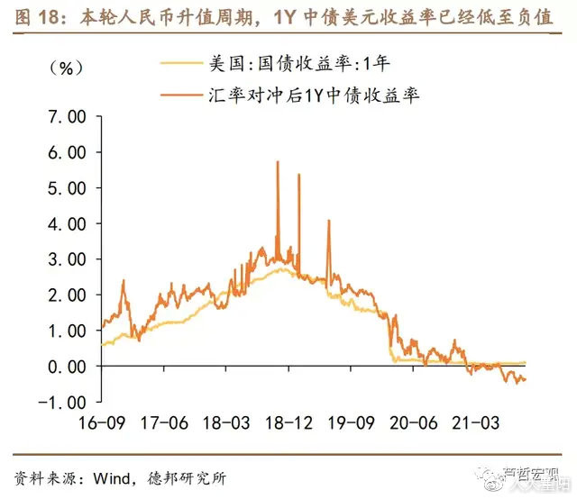 **本輪人民幣匯率升值後,經匯率折算的中債美元收益率已經低於美債收益率。**我們用掉期基差(Swap Basis)度量人民幣本幣資產的對沖成本。2020年二季度以來人民幣匯率快速升值,一個直接的市場效應是推高了掉期基差水平,Swap Basis從0.6-0.7的水平一路上漲至2021年10月份的2.70以上,導致“買入持有人民幣資產並用掉期鎖定換匯收益”的對沖成本上升,對沖成本抬升間接“侵蝕”掉了中資資產的美元回報率空間,以掉期基差作為對沖成本的度量,2020年二季度人民幣匯率開啓升值週期後,經匯率對沖後的中債美元收益率相較美債下滑更為顯著。經過匯率對沖折算後,10年期中債的美元收益率水平僅有0.28%,而1年期中債的美元收益率則為-0.37%。