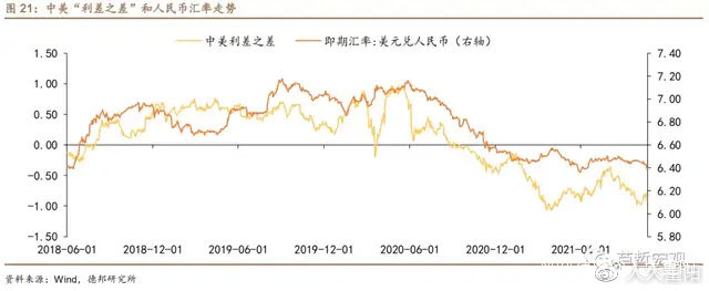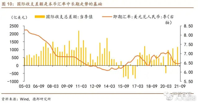 從基於國際收支的角度看,2005年第一次匯率改革之後,貿易紅利推動國際收支持續維持順差狀態,“雙順差”釋放人民幣匯率升值潛力,直至在2014年至2016年期間,國際收支逆差給予人民幣貶值壓力。2017年之後國際收支差額轉為順差再次推動人民幣匯率重新走向升值通道,2018年因“中美貿易摩擦”,人民幣匯率承受了較強的貶值壓力;從2018年12月至2019年9月,人民幣匯率連續受到中美貿易摩擦反覆的擾動,可在此期間國際收支順差卻保持穩定。2020年疫情爆發後,供應鏈的完備性和生產的快速恢復導致中國出口份額增加,驅動國際收支順差達到僅次於2017年以來的高點,成為2020年至2021年本輪人民幣匯率升值週期的基礎。