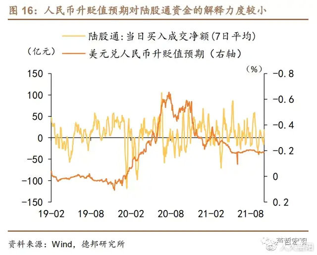 從陸股通資金和人民幣匯率之間的聯繫角度,人民幣升貶值預期並不決定證券投資資金流入中國市場的規模,而後者也不能反映對人民幣匯率的升貶值看法,因此包括陸股通在內的證券投資跨境流動,是美元指數漲跌背後的全球風險偏好、美元流動性等因素決定的,其流入不能反映人民幣匯率升值,流出亦非貶值預期。