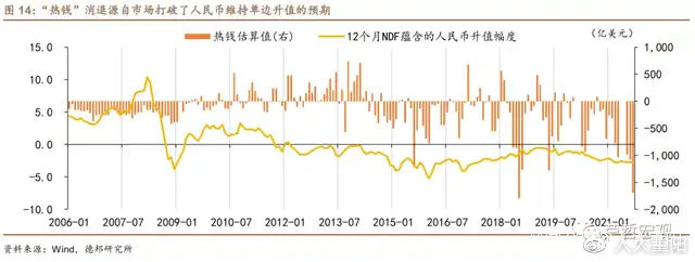 和顯性體現在國際收支中的證券投資驅動因素類似,不能完全體現在國際收支中的“熱錢”流動和美元流動性環境、無風險套息交易以及全球風險偏好密切相關。從我們估算的“熱錢”規模和流向來看,2020年至2021年“熱錢”維持淨流出態勢,同期以12個月NDF度量的貶值預期加強,可實際上“熱錢”流出並沒有遏制人民幣升值,迥然不同於2005年第一次匯率改革後“熱錢”流動和人民幣匯率升貶值預期之間的關係。