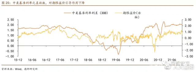 **貨幣政策週期差對人民幣匯率的解釋力度下降。**另外一個通行的解釋人民幣匯率波動的角度是基於中美之間的貨幣政策週期差,然而從2015年“8.11”人民幣二次匯率改革之後,中國的貨幣政策制度也經歷了框架性變化,即從數量型框架轉向價格型框架,若以中美基準利率之差作為中美貨幣政策週期差的度量指標,從2021年8月份以來貨幣政策週期差已經漸趨平穩,對人民幣匯率期限溢價以及波動率的影響也趨於平靜。這也反映出若11月至12月美聯儲開啓Taper,對人民幣匯率以及波動率的影響不及2014年至2016年。