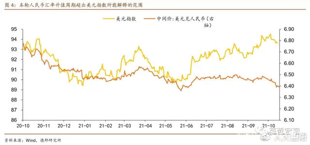 **從中長週期角度看,10月份人民幣匯率破位升值是2020年6月升值週期的延續,或仍未觸及升值週期的頂部。**拉長時間窗口,10月份人民幣匯率破位升值其實並不意外,而是2020年二季度以來人民幣匯率升值週期的延續。回溯本輪升值週期,當2020年5月28日“港版國安法”出台導致人民幣匯率在資本流出的恐慌預期之下觸及貶值週期的頂點以後,以此作為起點人民幣匯率開啓本輪週期。然而在本輪升值週期中,並不同於以往“弱美元”的大環境,本輪人民幣匯率升值超出了美元指數下跌的解釋範圍,即便是10月19日當週人民幣匯率強勢走高0.79個百分點,美元指數也僅僅是高位回調0.38個百分點,從人民幣匯率本輪升值週期的起點計算,2020年5月28日至2021年10月22日期間美元指數下跌4.94%,同期人民幣匯率升值幅度則達到10.16%。人民幣匯率升值遠超美元指數貶值幅度,説明人民幣本輪升值的基礎依然在人民幣自身的“基本面”。