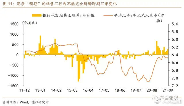 結售匯差額雖然指向居民和企業部門形成的外匯的相對供需強弱,但是由於居民和企業部門將“升貶值預期”也體現在結售匯行為中,在人民幣匯率升值預期較為一致時,居民和企業部門往往會推遲購匯、主動結匯,導致比國際收支更高頻率公佈的結售匯差額,以及度量“結售匯意願”的結售匯比率並不完全反映即期匯率變化,混雜了“預期”的市場行為對短期匯率波動產生了較大擾動。