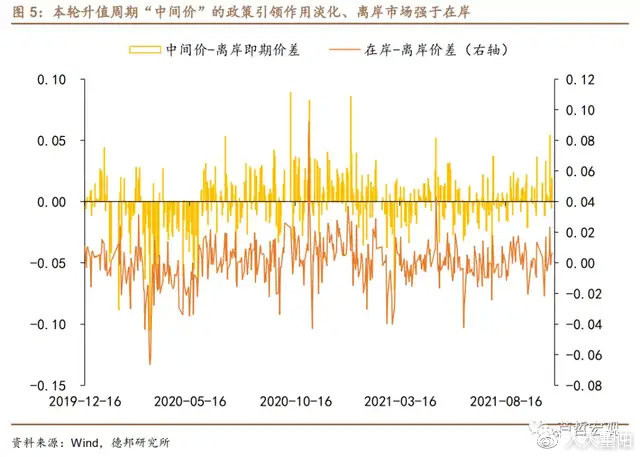 儘管美元兑人民幣匯率中間價、在岸即期匯率和離岸即期匯率,在不同階段各自發揮過穩定或引領市場的作用,但是從2020年三季度至2021年四季度,離岸匯價強於在岸市場,常常發揮價格引領作用,説明本輪升值週期,匯率政策貢獻並不大,市場化升值是主要趨勢。截止10月22日的數據顯示,從2020年5月28日起計算中間價累計升值10.37%,在岸即期匯率升值10.51%,離岸即期匯率升值10.69%,表現出“離岸匯價>在岸匯價>中間價”的強勢特徵。
