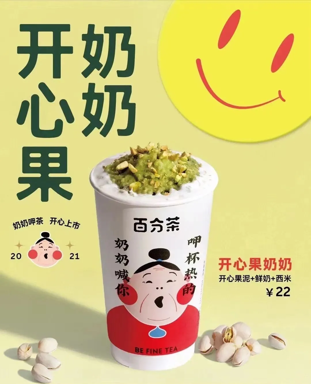 正想喝點熱的時,看到百分茶海報上一句“奶奶喊你呷杯熱的”,被這句話打動,毫不猶豫下單了一款其“開心果奶奶”新品。