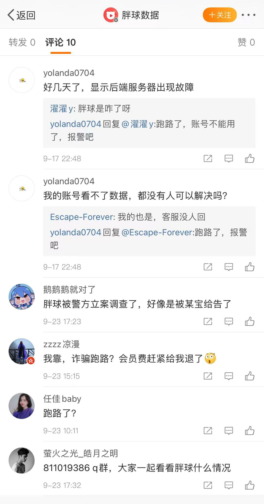 不少用户到胖球的官方微博下留言,質疑胖球已經跑路。