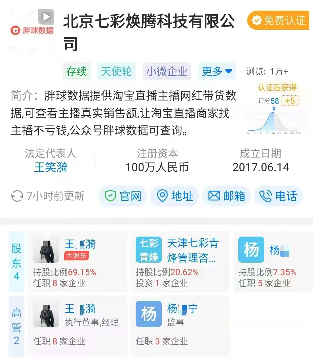 據天眼查數據,胖球數據的運營公司是北京七彩煥騰科技有限公司,成立於2017年6月。