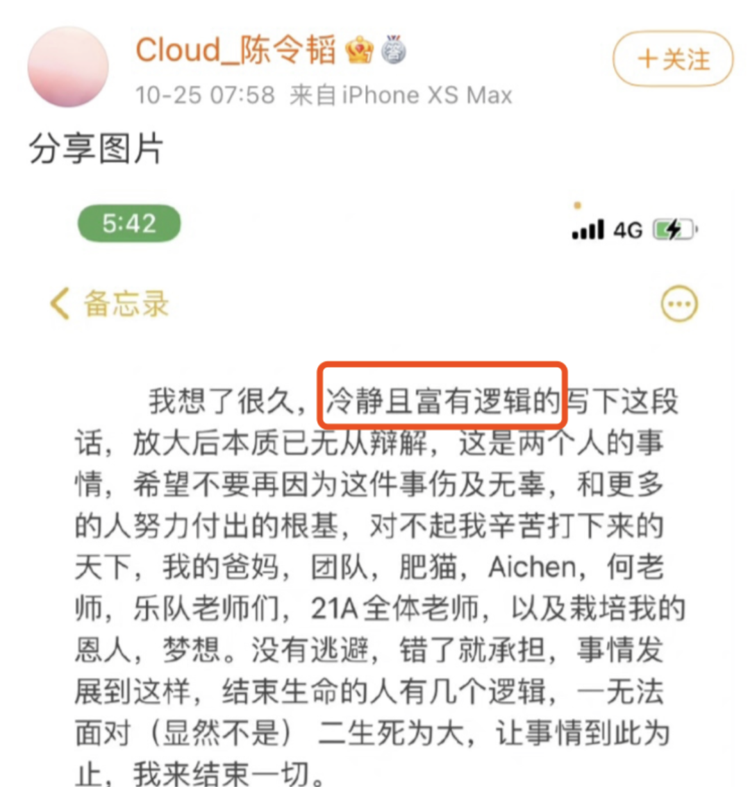 當事男主陳令韜在邊充電邊打電話的情況下,寫了一封自認為極其冷靜且富有邏輯的“遺書”交代後事。